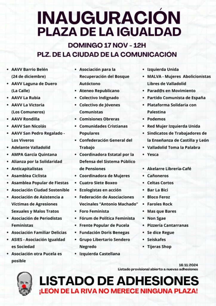 Somos muchos/as quienes creemos que los posicionamientos políticos y las declaraciones de León de la Riva, así como sus procesamientos judiciales por casos de corrupción urbanística no le hacen digno de un reconocimiento de este tipo por parte del conjunto de la ciudad; su figura no reúne la aprobación social necesaria para ello. Y Valladolid, desde luego, tampoco se merece que se ensalce en su nomenclatura a León de la Riva. Proponemos, en cambio, que el lugar reciba un nombre alternativo que esté exento de polémica y que sea capaz de generar un mayor acuerdo social. Planteamos tres opciones: la vallisoletana Beatriz Bernal, primera novelista en castellano que publicó sus obras en el siglo XVI; la también escritora Elena Santiago, múltiples veces premiada y fallecida recientemente en nuestra ciudad; o el nombre de Plaza de la Igualdad, que engloba todo lo que atacó León de la Riva durante sus mandatos: a las mujeres, a los matrimonios igualitarios, a los barrios obreros, al mundo de la cultura, etc.